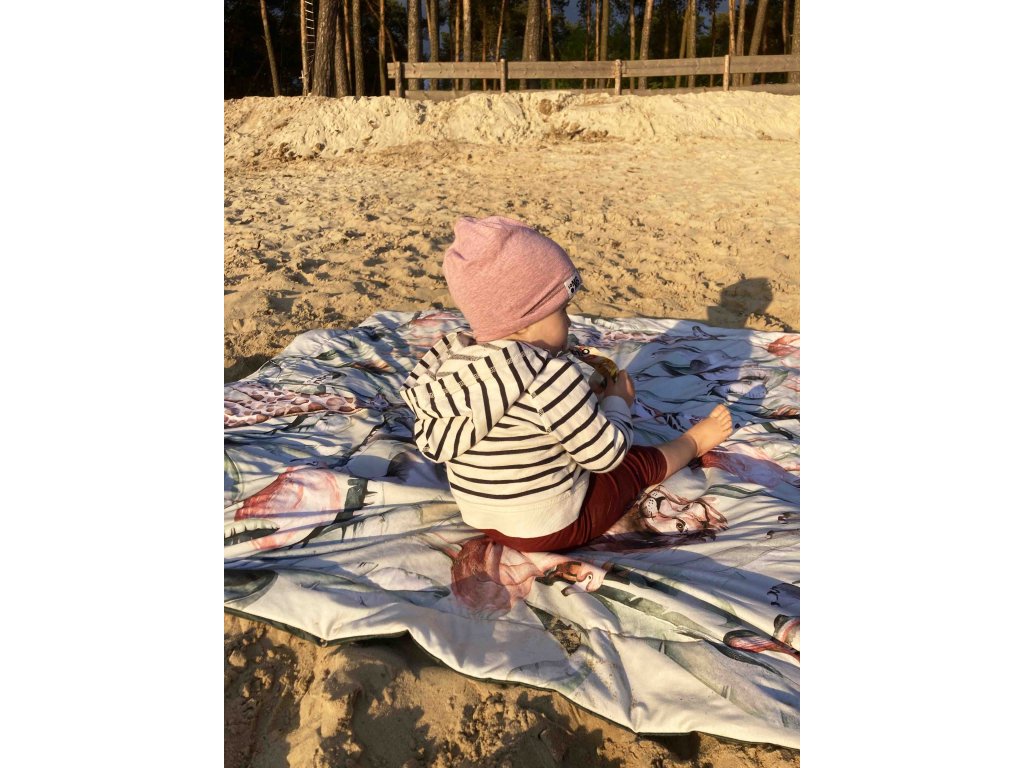 Deka na pláž nebo na piknik je velmi praktická, součástí je i bavlněný batůžek, takže ji máte vždy po ruce nebo v kočárku, připravenou k použití.